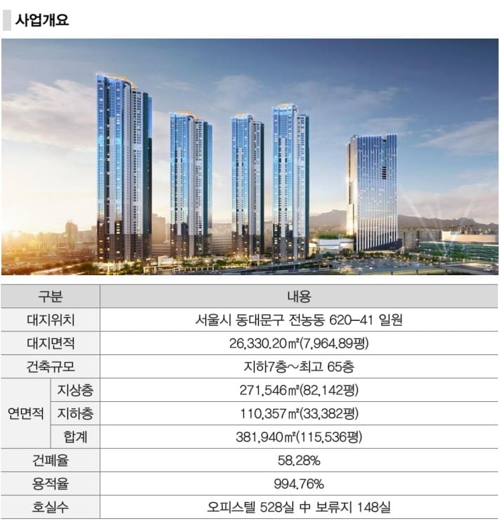 단지는 1,425세대의 4개동 아파트 단지와 오피스텔, 상가, 업무시설 등이 들어서는 랜드마크타워 1개동으로 구성됩니다. 오피스텔이 들어서는 랜드마크타워는 42층 건물로, 27~42층에 들어서며 총 528실 규모다. 일반분양은 148실 예정입니다.